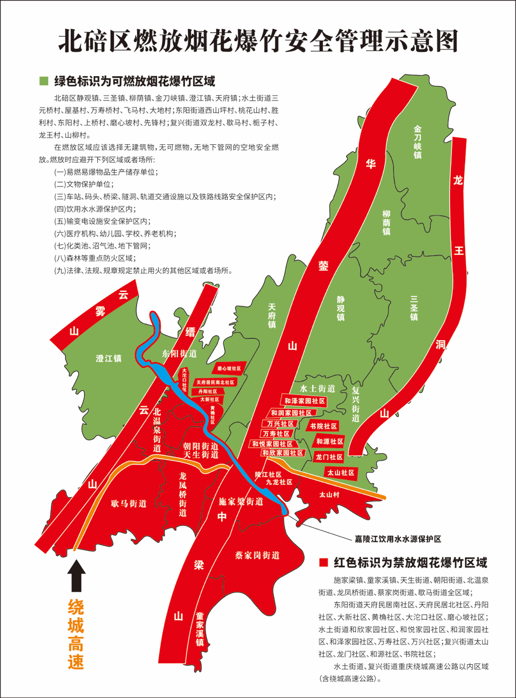 据介绍,重庆中心城区可以燃放烟花爆竹的区域主要集中在渝北区、北碚区、巴南区。