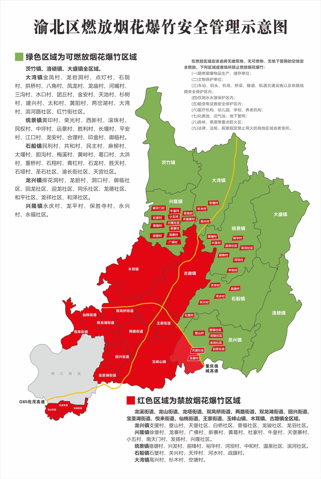 具体区域为渝北区的茨竹镇、洛碛镇、大盛镇;大湾镇金凤村、龙岩洞村、点灯村、石院村、拱桥村、八角村、凤龙村、龙庙村、河嘴村、三沟村、水口村、团丘村、金安村、天池村、杉树村、建兴村、太和村、黄阳村、两岔湖村、大湾村、滨河路社区、红竹街社区;统景镇黄印村、荣光村、西新村、滚珠村、民权村、中坪村、远景村、胜利村、长堰村、平安村、江口村、龙安村、合理村、印盒村、御临村;石船镇民利村、共和村、民主村、麻柳村、大堰村、胆沟村、梅溪村、黄岭村、葛口村、太洪村、重桥村、石翔村、青杠村、石龙村、胜天村、石垭村、圣石社区、渝长街社区、天宫社区;龙兴镇排花洞村、龙胆村、洞口村、御临社区、回龙社区、迎龙社区、同乐社区、龙德社区、和平社区、龙祥社区、和泽社区;兴隆镇永庆村、龙平村、保胜寺村、永兴村、永福社区。
